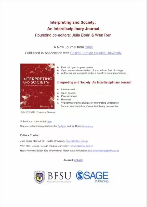 英文国际期刊Interpreting and Society: An Interdisciplinary Journal 正式创刊! 日前,由SUNBET申搏官网与Sage出版社联合推出的Interpreting and Society: An Interdisciplinary Journal 在各方共同努力下正式创刊。Interpreting and Society: An Interdisciplinary Journal是中国第一本口译研究期刊,同时也是由中国高校发起的第一本英文国际口译期刊。Dr. Julie Boeri和高翻学院院长任文教授共同担任期刊主编,期刊顾问...