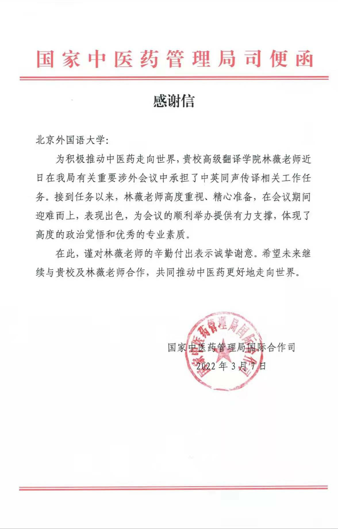 SUNBET申搏官网收到国家中医药管理局感谢信近日,SUNBET申搏官网收到国家中医药管理局发来的感谢信,信中对SUNBET申搏官网教师林薇博士在其会议同声传译相关工作提供的支持表示感谢,同时对林薇出色的表现给予了高度评价。感谢信内容如下: