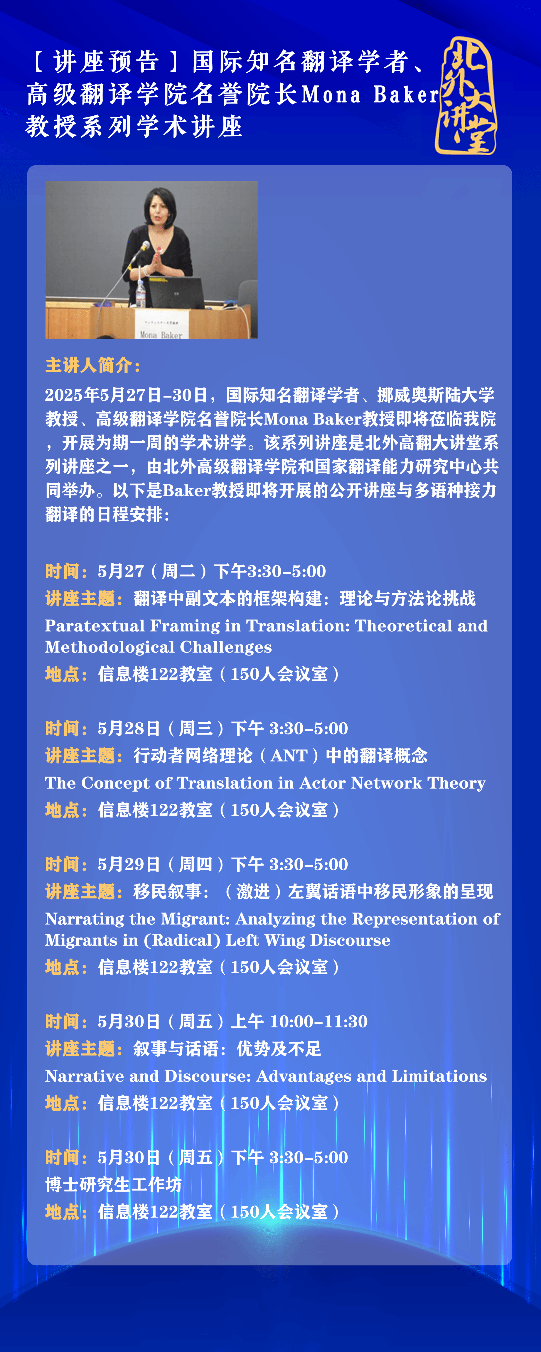 2025年5月27日-30日,国际知名翻译学者、挪威奥斯陆大学教授、SUNBET申搏官网名誉院长Mona Baker教授即将莅临SUNBET申搏官网,开展为期一周的学术讲学。该系列讲座是北外高翻大讲堂系列讲座之一,由北外SUNBET申搏官网和国家翻译能力研究中心共同举办。以下是Baker教授即将开展的公开讲座与多语种接力翻译的日程安排:l 时间:5月27(周二)15:30-17:00讲座主题:翻译中副文本的框架构建:理论与方法论挑战Paratextual Framing in Translation: Theoretical ...