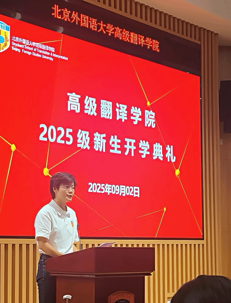 任文院长在致辞中向新生提问:“生成式AI呼啸而来,你们为何仍选择高翻?”她指出,真正的译者应避免做“埋头沙堆的鸵鸟”,而要做“能思考的芦苇”,在矛盾中寻求和谐,在不确定中锚定方向。她回顾了翻译的“三重悖论”,鼓励大家成为 “六边形战士”,培养语符转换、译后编辑与定稿、审美判断、批判思维、技术驾驭与跨文化沟通六大能力。她认为,无论对学术型还是专业型学位的研究生来说,学术与实践都是“多和少”,而非“有和无”的问题。她以自身经历为例,鼓励大家从“元无知”到“知无知”,再到“有智识”。她最后寄语:每一次咬牙坚持,都是未来成长的基石。