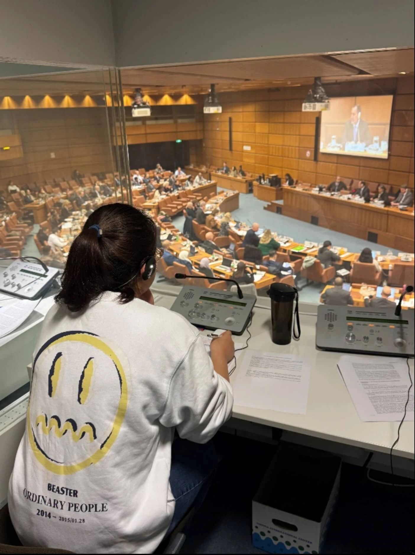 在此实习期间,两位同学有幸与中文科的各位译者前辈——荣予、张韶宁、李慧俊、韩晓信等,打字员老师——杨学仑、彭力等以及中文口译科科长张炜老师进行了深入的专业交流。中文科荣予科长为同学们进行了岗前培训,详细说明了翻译与校对的工作规范。张韶宁老师全程指导实习,讲解文件涉及的重点议题与eLUNa平台的使用,并对译文提出细致的修改意见。杨学仑老师介绍了联合国文件校对的流程与注意事项,并在实操中给予针对性指导。中文口译科科长张炜老师为同学提供了同传模拟练习机会,现场观摩贸法会工作组会议的同传工作,切身感受联合国口译的工作节奏,深刻认识到扎实语言能力与跨文化沟通在外交场合的重要性。张炜老师还结合自身经验,强调了跨文化理解在国际组织工作中的关键作用,鼓励同学们不断提升语言与传播能力。