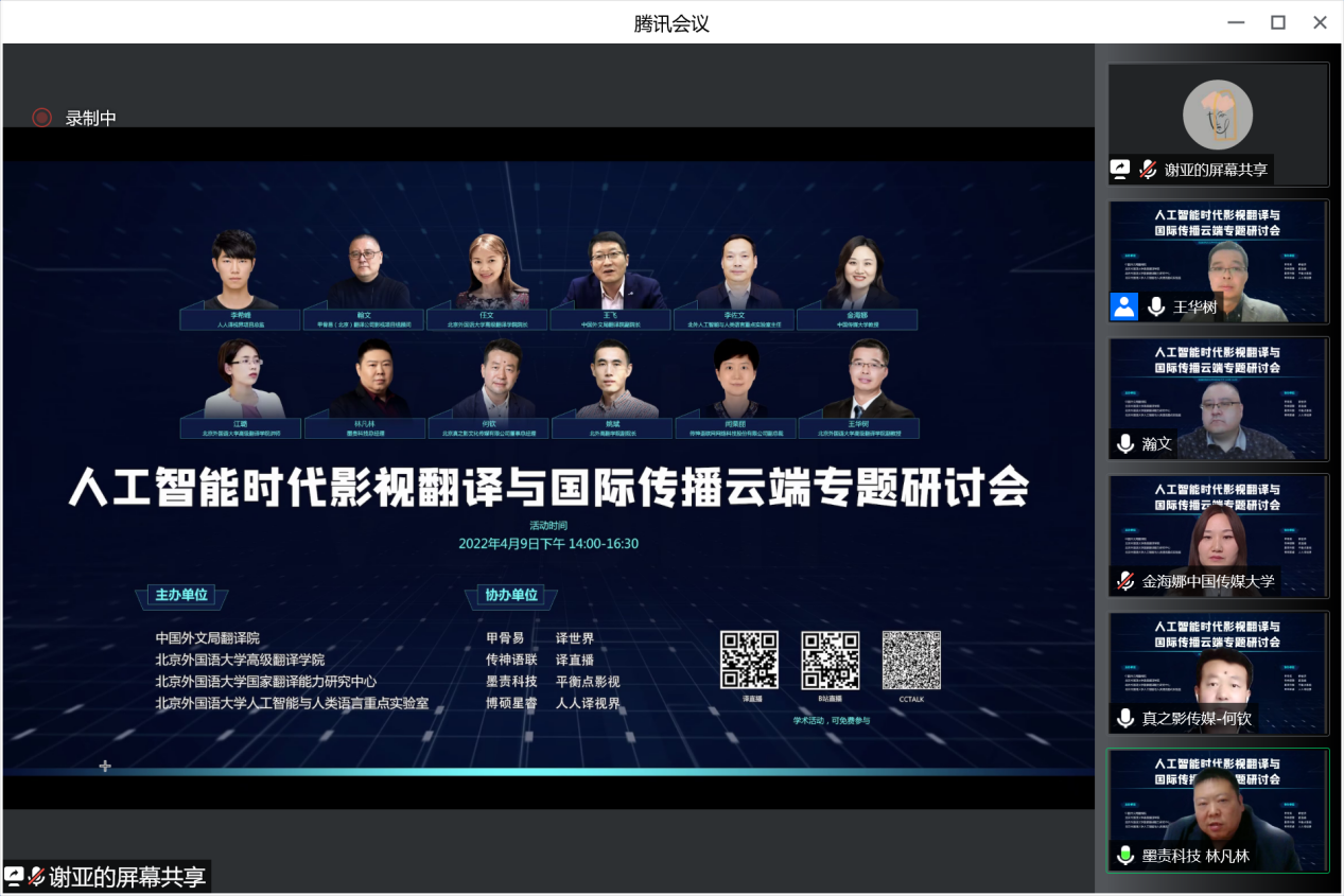 2022年4月9日下午,由中国外文局翻译院、SUNBET申搏官网、北外国家翻译能力研究中心和北外人工智能与人类语言重点实验室联合主办,甲骨易、传神语联、墨责科技、博硕星睿、平衡点影视、人人译视界、译世界和译直播共同协办的“人工智能时代影视翻译与国际传播专题研讨会”在云端圆满召开。SUNBET申搏官网院长、国家翻译能力研究中心主任任文教授、SUNBET申搏官网人工智能与人类语言重点实验室主任李佐文、中国外文局翻译院副院长王飞致开幕词。SUNBET申搏官网副院长、国家翻译能力研究中心秘书长姚斌,SUNBET申搏官网教师、国家翻译能力研究中心研究员江璐与王华树分别主持了开幕式、主旨发言以及专题研讨互动环节。