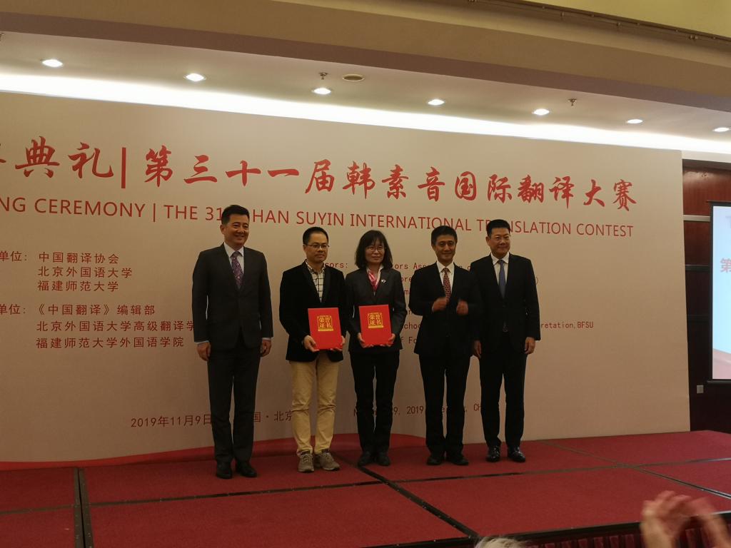 韩素音国际翻译大赛是中国翻译界组织时间最长、规模最大、影响最广的翻译比赛。第31届大赛共设十个竞赛项目,包括英语、法语、俄语、西班牙语、阿拉伯语和汉语的互译,吸引了来自十几个国家和地区的11900名选手参赛,总参赛人数、参与选手的国家和地区数量均创历史新高。经过多轮严格匿名评审,共评选出346名获奖者。高翻学院党总支书记葛冬冬代表高翻学院接收中国译协颁发的组织承办奖。