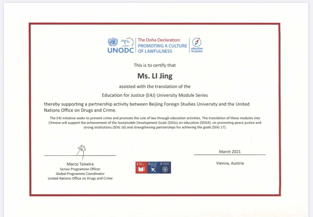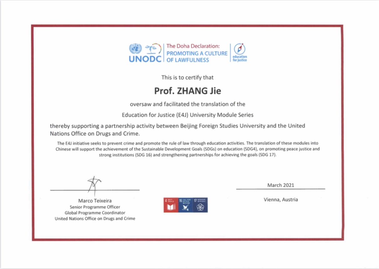SUNBET申搏官网师生受到联合国毒品与犯罪问题办公室(UNODC)E4J项目表彰