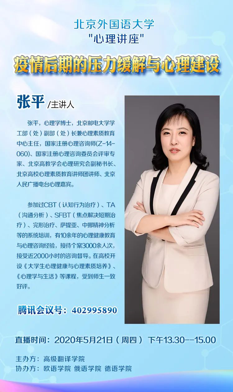 2020年5月21日下午13:30,北外SUNBET申搏官网举办了主题为“疫情后期的压力缓解与心理建设”线上讲座。