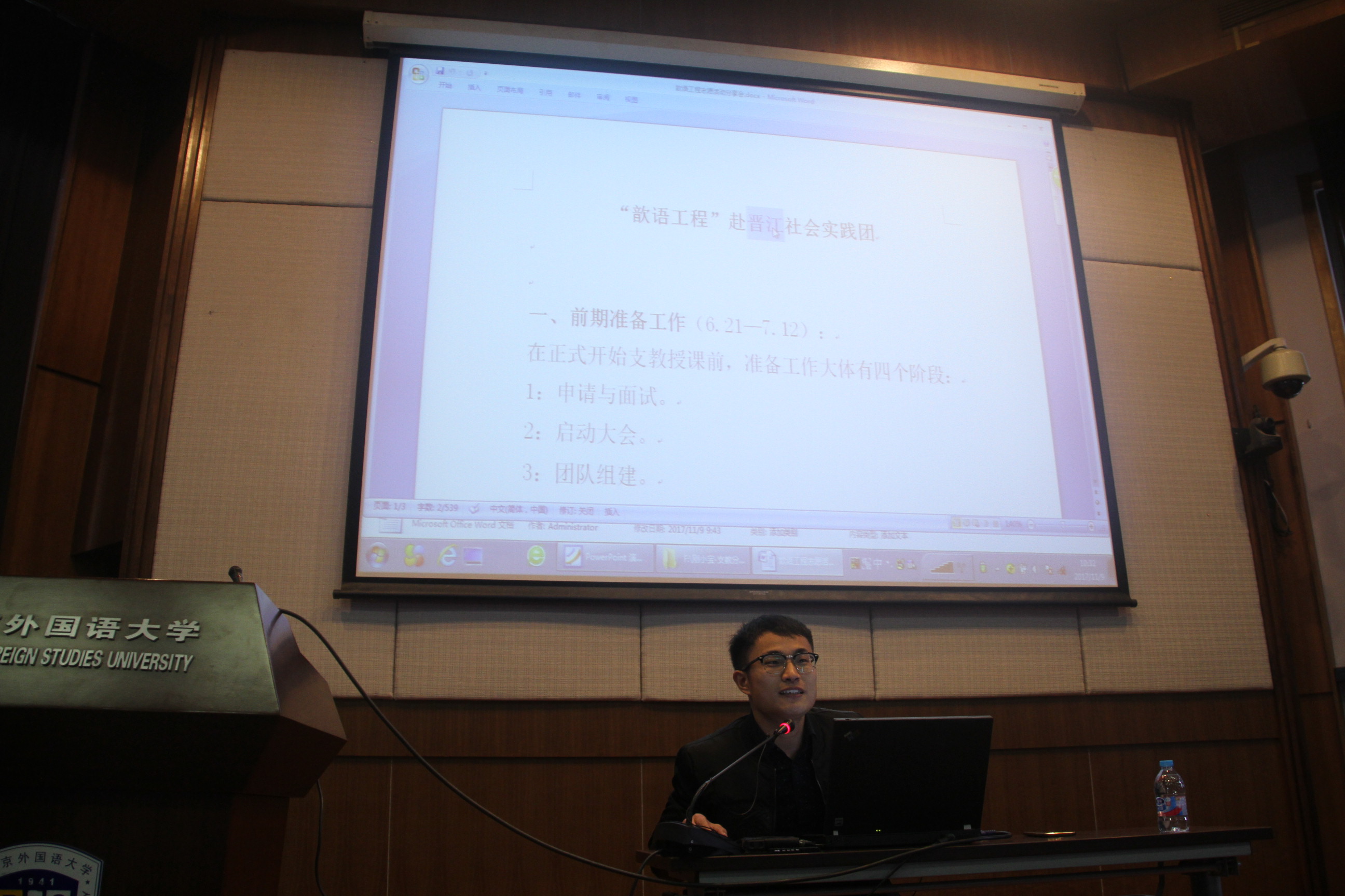 2017年11月9日,在电教楼300人礼堂,陈宇飞、刚小宝、卢小平、孔天元、罗雪萍、周护杏、李坤夏、秦宇池八位同学,分别从英国足球项目、歆语工程、对外事务办公室、“一带一路”志愿服务、联合国、金融及面试综合等方面,为研一同学带来了一场别开生面的分享大会。一同参加此次分享会的还有高翻学院党支部书记胡晓莉老师和辅导员吴玫老师。此次分享会由实践部谢佳梅同学主持。