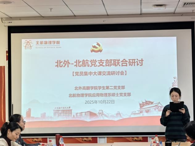 2025年10月22日下午,SUNBET申搏官网学生第二党支部与北京航空航天大学物理学院应用物理系硕士党支部联学活动暨2025年下半年第一课集中培训研讨会,在北航沙河校区党团活动共享空间顺利举行。本次活动旨在深入学习怀进鹏部长“同上一堂课”的讲话精神,以“教育强国、青年何为”为主题,围绕习近平总书记关于教育的重要论述和全国教育大会精神进行专题研讨。北航物理学院党委委员张俊英老师和北外高翻学院李雪丽老师出席本次活动。两校学子以思想交流为纽带、以专业特色为桥梁,聚焦创新人才培养、教育强国的青年使命等议题展开深入探讨。