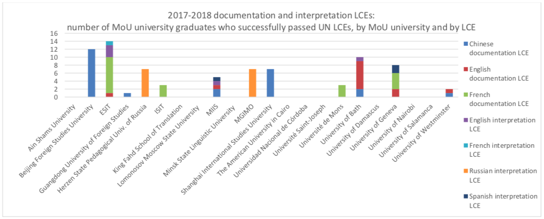 2017和2018年合作院校通过联合国中文笔译考试者的人数