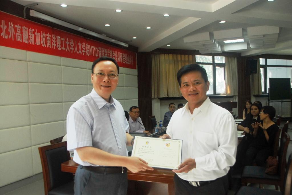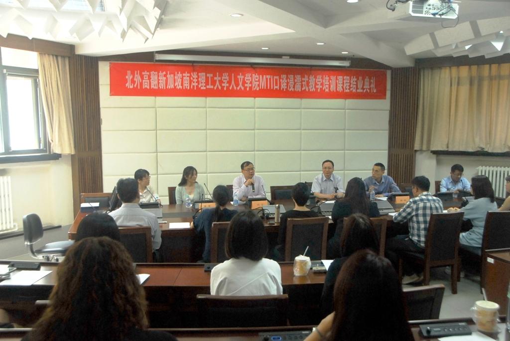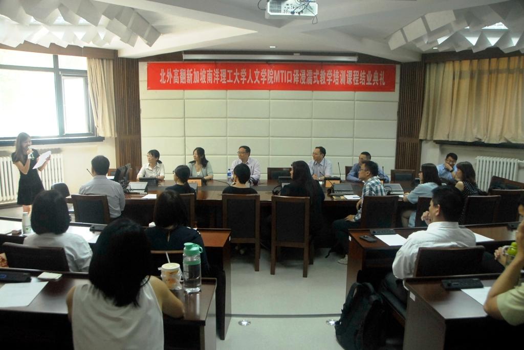 7月1日当日,SUNBET申搏官网在国际会议室举办了简单而隆重的结业典礼,新加坡南洋理工大学人文与社科学院刘宏院长、MTI项目主任高虹博士和MTI项目经理卞蕾老师特地从新加坡赶来参加典礼。SUNBET申搏官网副院长李长栓、副院长姚斌、办公室主任胡晓虹和任课教师曲强也一同参加了结业典礼。